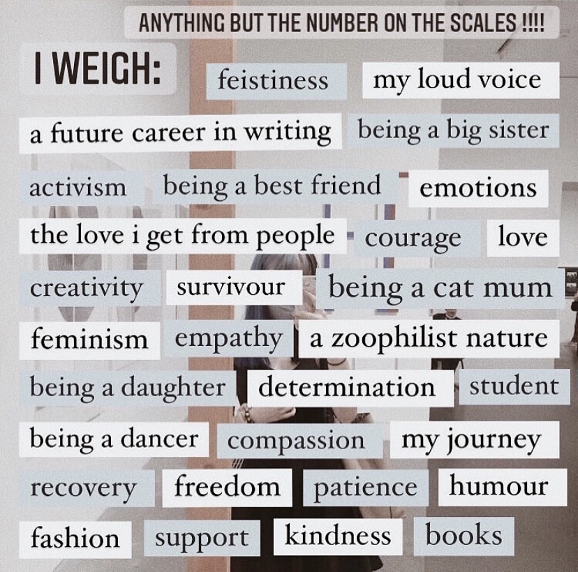 I heard about this “I Weigh” idea on a podcast I listened to yesterday morning. It was specifically speaking about your body weight (eating disorders / disordered eating). As a woman especially (in my *cough* mid-40s) all of these things really surface… weight, wrinkles, you name it… BUT body image/weight is always a factor at in age, and in today’s society of social media, it is starting dangerously young. On the FLIP SIDE ~